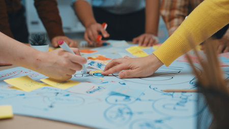 Group of people using mind map sharing marketing idea and brainstorm plan. Closeup of smart business working together to draw mind map by using marker and plan creative start up project. Convocation.
