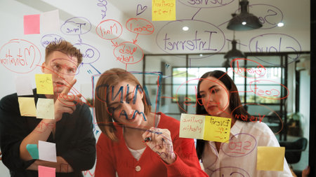 Creative business team brainstorming and sharing marketing idea about start up project by writing down on colorful sticky note at glass board modern meeting room. Working together. Immaculate.