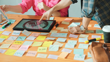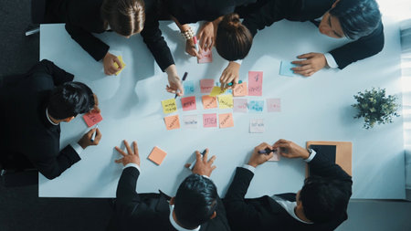 Top view of smart business team planning marketing strategy at meeting room. Professional executive manager exchange data and brainstorm idea while writing in sticky notes at workplace.