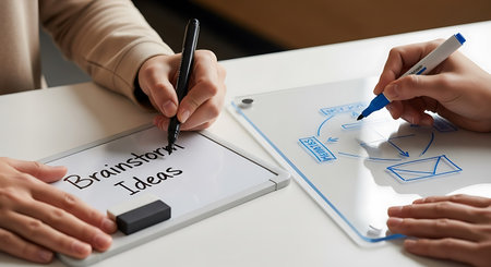 two people are brainstorming ideas on whiteboards during a collaborative meeting session at the office