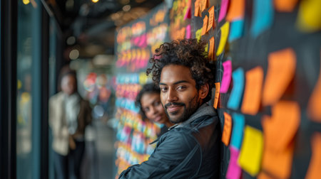 A young Indian businessman contemplates strategy, surrounded by colorful sticky notes. This modern office scene captures creativity and teamwork.