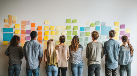 Creative collaboration occurs as diverse group of individuals engages with colorful sticky notes on wall, showcasing teamwork and brainstorming in modern workspace