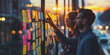 Business professionals engaged in collaborative brainstorming with a wall of sticky notes