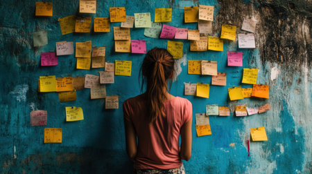 A girl stands in front of a vibrant wall filled with sticky notes, showcasing creativity and organization. This scene captures inspiration and thought processes.