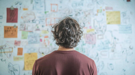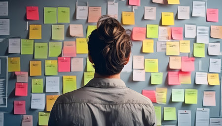 Person making decisions looking at wall of notes. Corporate office concept options, generated by AI. High quality photo
