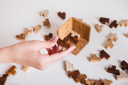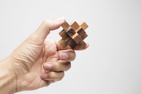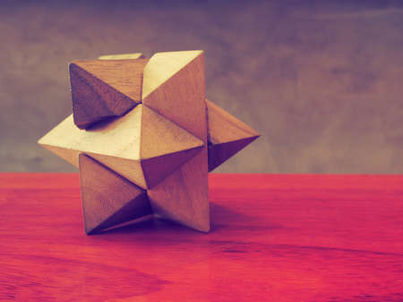Wood puzzle, brain teaser closeup. Wooden game block, brainteaser, logic game, mechanical puzzles, logic 3d toy, wood puzzle with selective focus
