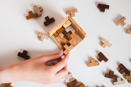 Man's hand inserting piece of wood block to complete a pyramid shape of wood blocks. Top view.