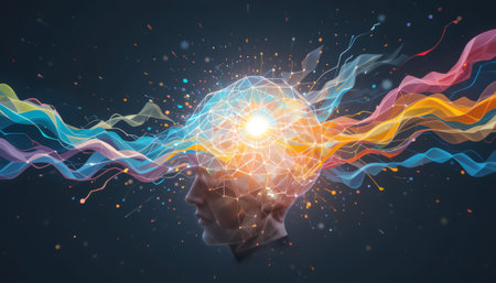 A vibrant background with a brain made of overlapping, swirling colors and abstract shapes, set against a smooth, gradient backdrop.