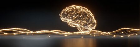 A luminous abstract digital a glowing human brain with intricate interconnected nodes and flowing light waves.