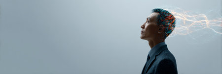 Asian businessman in profile, surrounded by glowing lines radiating from his head, symbolizing the concepts of artificial intelligence and deep learning in a futuristic context