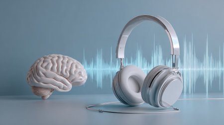 Unique illustration of a brain wearing headphones, symbolizing the connection between music, learning, and creativity. Perfect for educational or artistic projects.