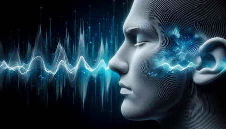 This digital artwork presents a profile of a human head with an illuminated brain and accompanying soundwave patterns. The composition utilizes a cool color palette with red highlights, emphasizing technical and scientific themes. The image's style appears modern and suitable for design, educational, or promotional material.