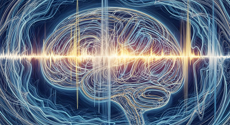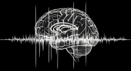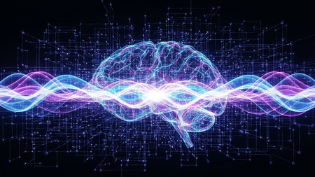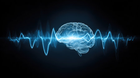 This image presents a stylized human brain superimposed with a dynamic digital wave, suggesting neural activity. The artwork features a cool blue color palette, contrasting the illuminated brain against a dark background. It is likely designed for science, technology, or medical publications, providing a visual representation of cognitive processes.