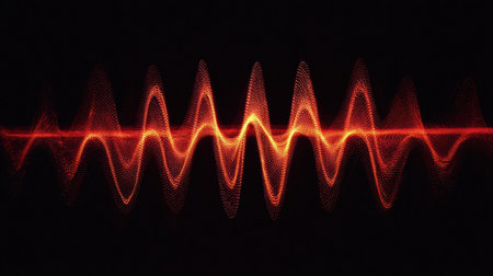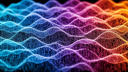 A digital abstract visualization of a sound wave with glowing particles and colorful ripples in a gradient from blue to orange.