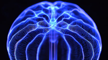 Stunning abstract visualization of a brain created with electric blue light waves, showcasing intricate patterns against a dark background.