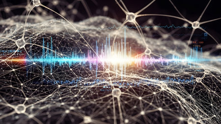 This image depicts a network of neurons with vibrant electrical impulses surging through them. The composition features a complex arrangement of interconnected cells, illuminated with a range of colors. This digital artwork, with its detailed structure and dynamic visual elements, could be suitable for scientific, educational, or technological applications.