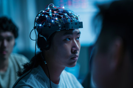 A close observation of a neural interface headset perched on a users head wires connecting to visible neurosensors that monitor brain activity in realtime..