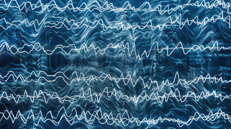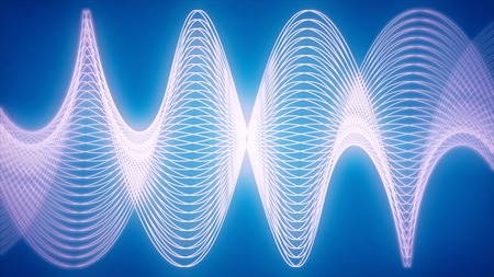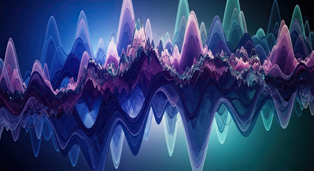 A dynamic visualization of oscillating frequency waves in a striking palette of blues, purples, and teals. This energetic background is suitable for topics related to music, technology, data, and digital communication.