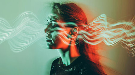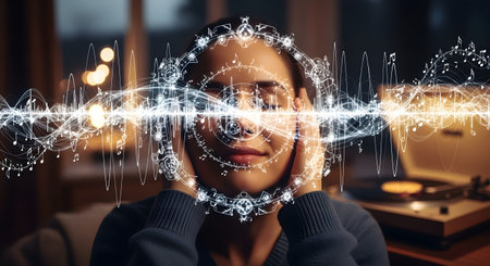 A woman with her eyes closed and hands over her ears is surrounded by an abstract, glowing visualization of sound waves and musical notes. The digital effect captures the feeling of being completely immersed in music, representing concepts of sound, harmony, and sensory experience.