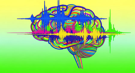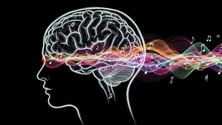 A detailed representation of a human brain with sound waves emanating from it, set against a dark background, symbolizing the connection between thought and music.