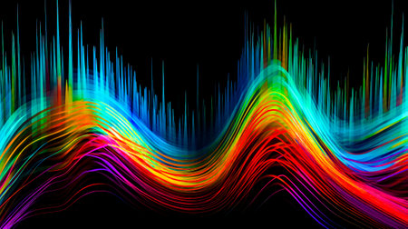 Vibrant waveforms showcase sound frequencies in colorful patterns against a dark backdrop, creating a captivating visual effect.