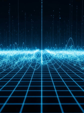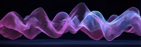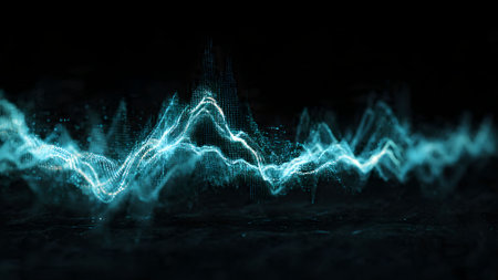 Abstract digital waveform background with glowing particles. Futuristic technology concept. Visualization of sound waves.