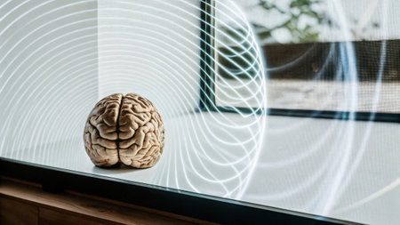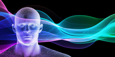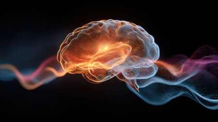 This abstract image showcases a silhouette of a brain emitting waves of thought and creativity, symbolizing cognitive processes and mental energy.