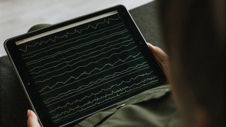 A closeup of the EEG sensor interface displaying realtime brainwave data on a tablet screen showing spikes and waves as the user meditates with the sensor visibly attached to their.