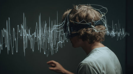 A young individual with a virtual reality headset explores an immersive digital world, surrounded by abstract sound waves symbolizing creativity and innovation.