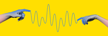 Two hands reaching out, connected by a wave-like line, symbolizing music, communication and connection. Contemporary art collage.