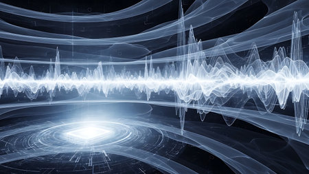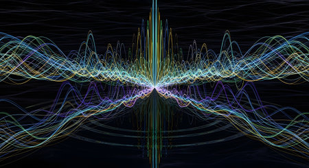 An abstract digital artwork depicts symmetrical, intersecting waves of colorful light on a black background. The intricate patterns of energy lines represent concepts like sound waves, quantum physics, data frequencies, or spiritual energy.