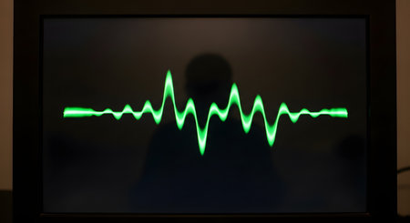 A close-up view of an electrocardiogram ECG monitor displaying a heart wave pattern, with vibrant lines showing the rhythm of a beating heart against a dark background
