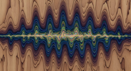 An abstract and high-resolution illustration of a wavy, undulating pattern that resembles both a sound wave and the texture of wood grain. The intricate design with colorful lines and swirls represents concepts of music, technology, and natural elements.
