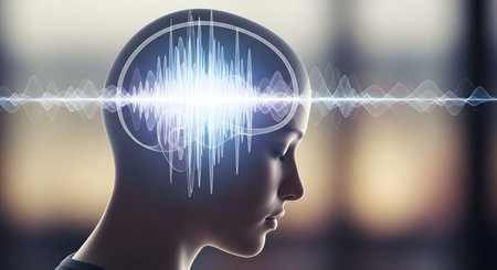 A conceptual image showing a silhouette of a person's head with a glowing, vibrant brainwave or soundwave pattern inside. The wave extends outwards, representing thought, consciousness, or brain activity.