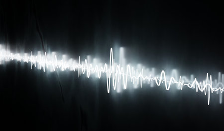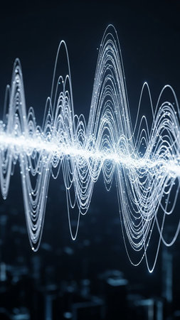 An abstract visualization of a digital sound wave composed of glowing white lines and particles against a dark, out-of-focus background.