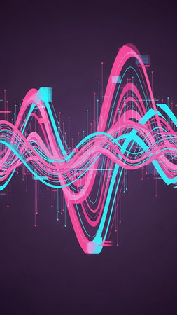 Abstract sound wave lines in vibrant pink and teal undulate across a dark purple background, interspersed with vertical data points.