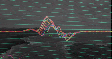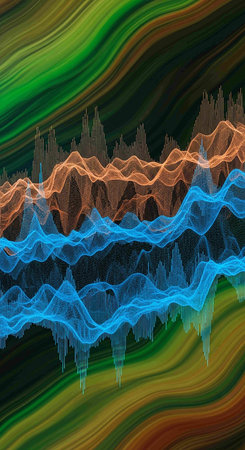 This abstract illustration presents a visualization of sound waves, rendered in vibrant colors. The design showcases a series of peaks and troughs, possibly depicting audio frequencies. The composition utilizes a gradient background and circular elements. It could be used for various design projects, including educational, commercial, or creative purposes.
