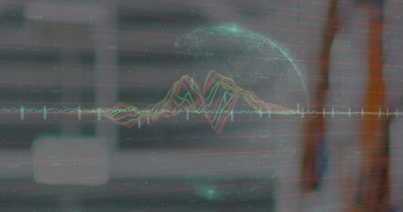 Image of round scanner spinning over statistical data processing against green background. Computer interface and business technology concept