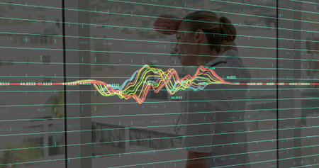 Image of light trails and data processing over dark background. Global finance, business, connections, computing and data processing concept digitally generated image.