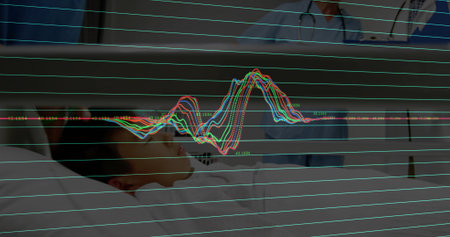 Medical team in scrubs reviewing boy patient at hospital bedside with waveform overlay, copy space. Healthcare, pediatrics, medical monitoring, professional team, patient care, clinical environment