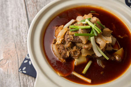 Closeup stewed pork leg in gravy soup and herb on wood table