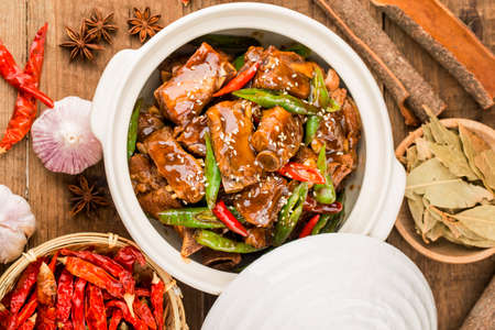 Chinese cuisine, pork in sweet and sour sauce served on the table