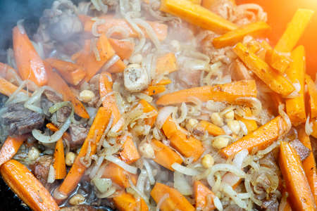 Onions with carrots are fried. Home cooking. Pilaf with meat