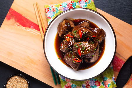 Homemade Filipino Adobo Pork in a white bowl on a black surface, top view. Flat lay, overhead, from above. Space for text.