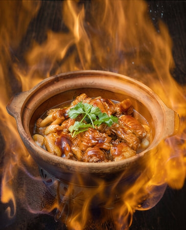 A rustic image of slow-cooked pork belly in a savory sauce, bubbling in a cast-iron pot, showcasing the rich flavors and tender texture of the dish