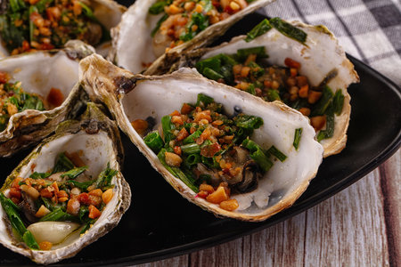 Close up of fresh oysters with garlic and chili sauce on black plate