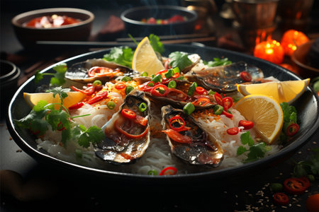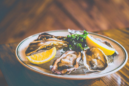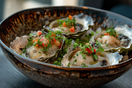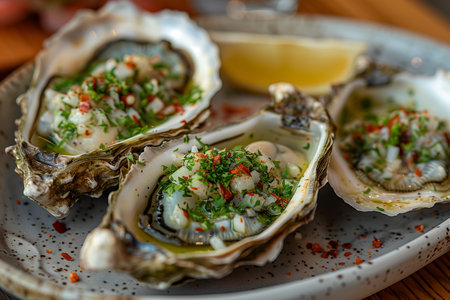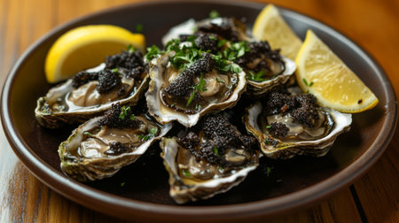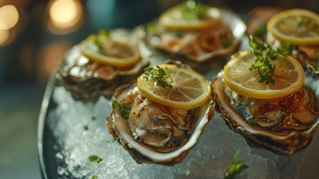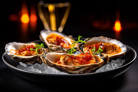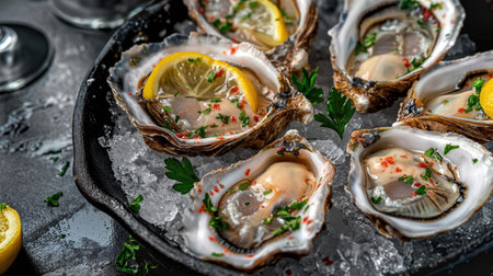 A delicious food composition featuring succulent oysters. Gourmet seafood photography on display
