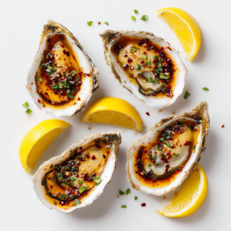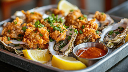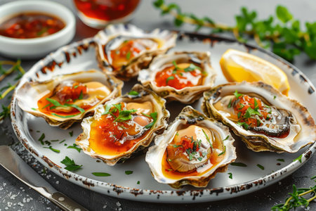 Indulge in fresh gourmet oysters complemented by lemon wedges and a spicy sauce, showcasing a perfect balance of flavor and presentation. Ideal for seafood lovers.