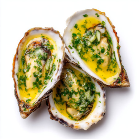 Indulge in the exquisite taste of freshly shucked oysters, complemented by a rich garlic butter sauce and a sprinkle of fresh parsley, perfect for any occasion.