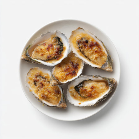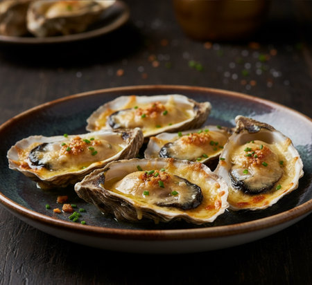 A plate of baked oysters featuring a crispy breadcrumb topping, ideal for seafood lovers seeking a gourmet appetizer or elegant dining experience.